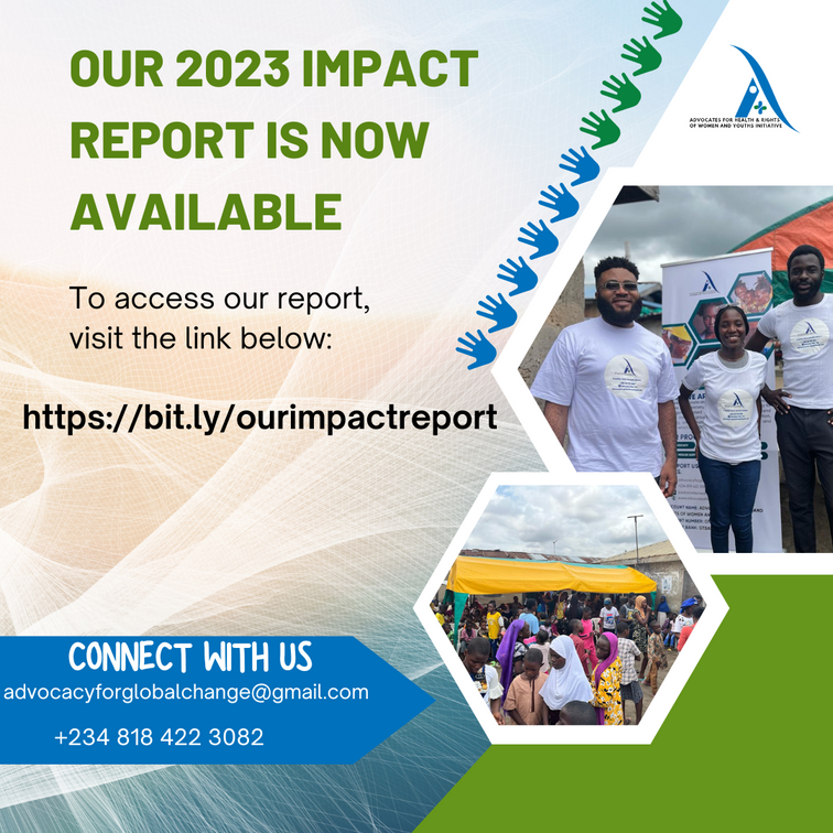 Thank you for your continued support of the Advocates for Health and Rights of Women and Youth Initiative. We are pleased to share with you our impact report for the year 2023. The report highlights the progress we have made in advancing the health and rights of women and youth in Nigeria. We are proud of the work we have accomplished, and we could not have done it without your generous support.